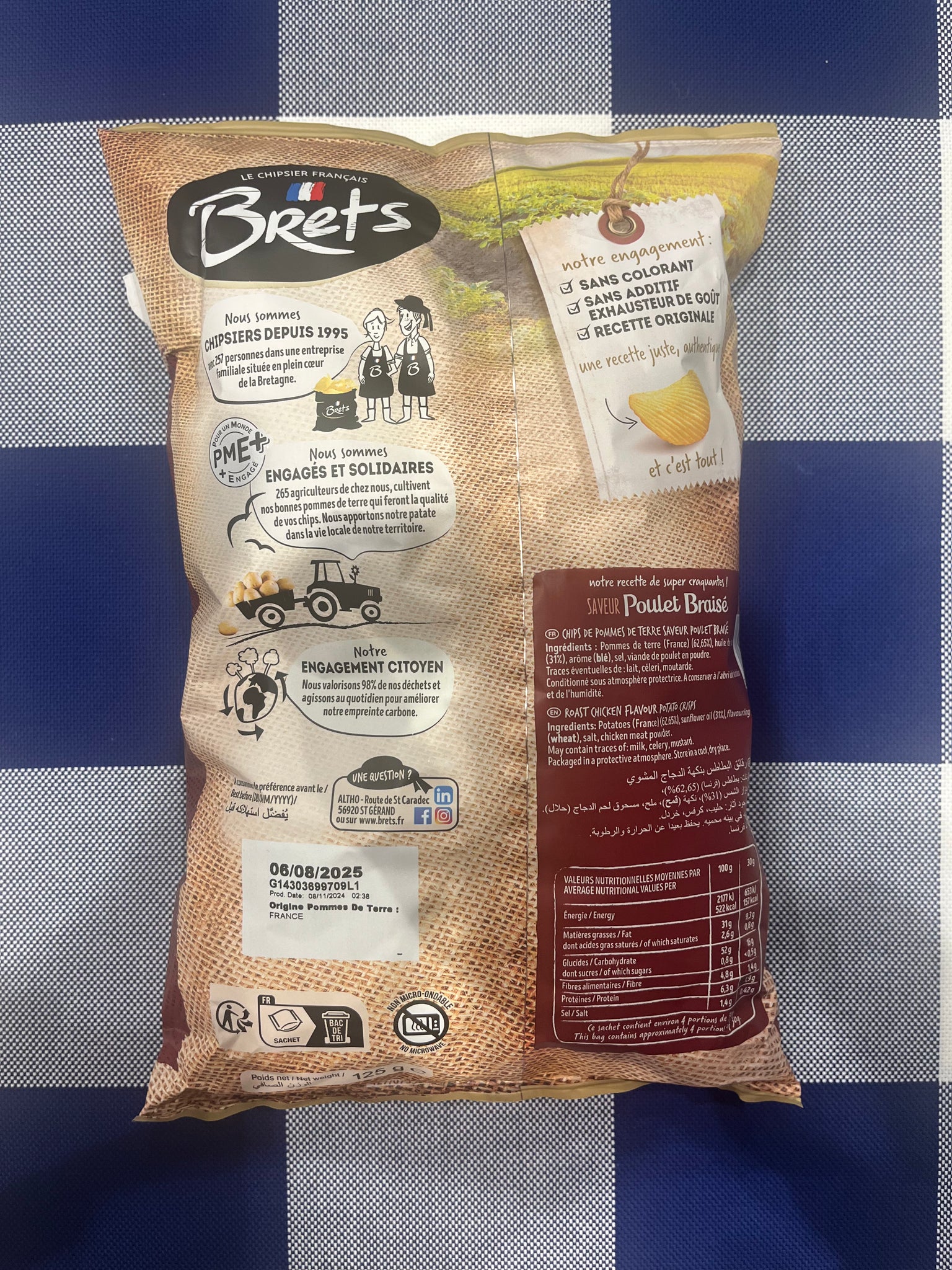 Potatoes (France) (61,9%), sunflower oil (31%), flavouring (wheat), salt, chicken meat powder. Possible traces of: milk, celery, mustard.