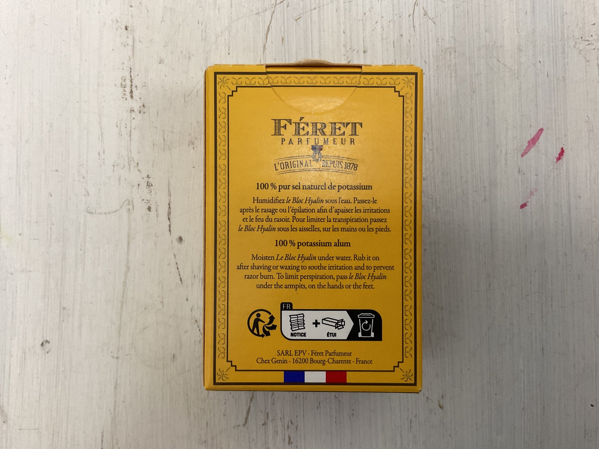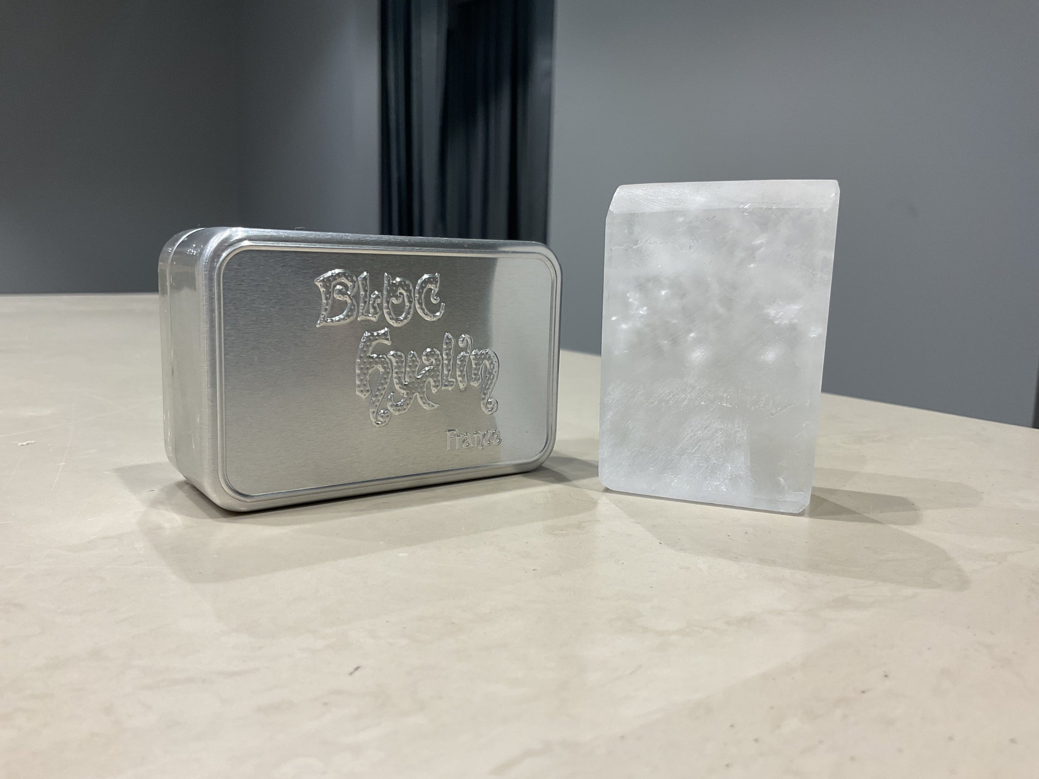 First brand in the world registered in France and abroad, The Hyaline Bloc has often been imitated, never equalled. You will recognize Le Bloc Hyalin by its slightly translucent appearance and by the mention “potassium alum” in the product ingredients. We recognize the real Hyaline Block visually by its marbled and somewhat transparent appearance, which qualitatively distinguishes it from synthetic alum stone with an opaque appearance (ammonium alum).