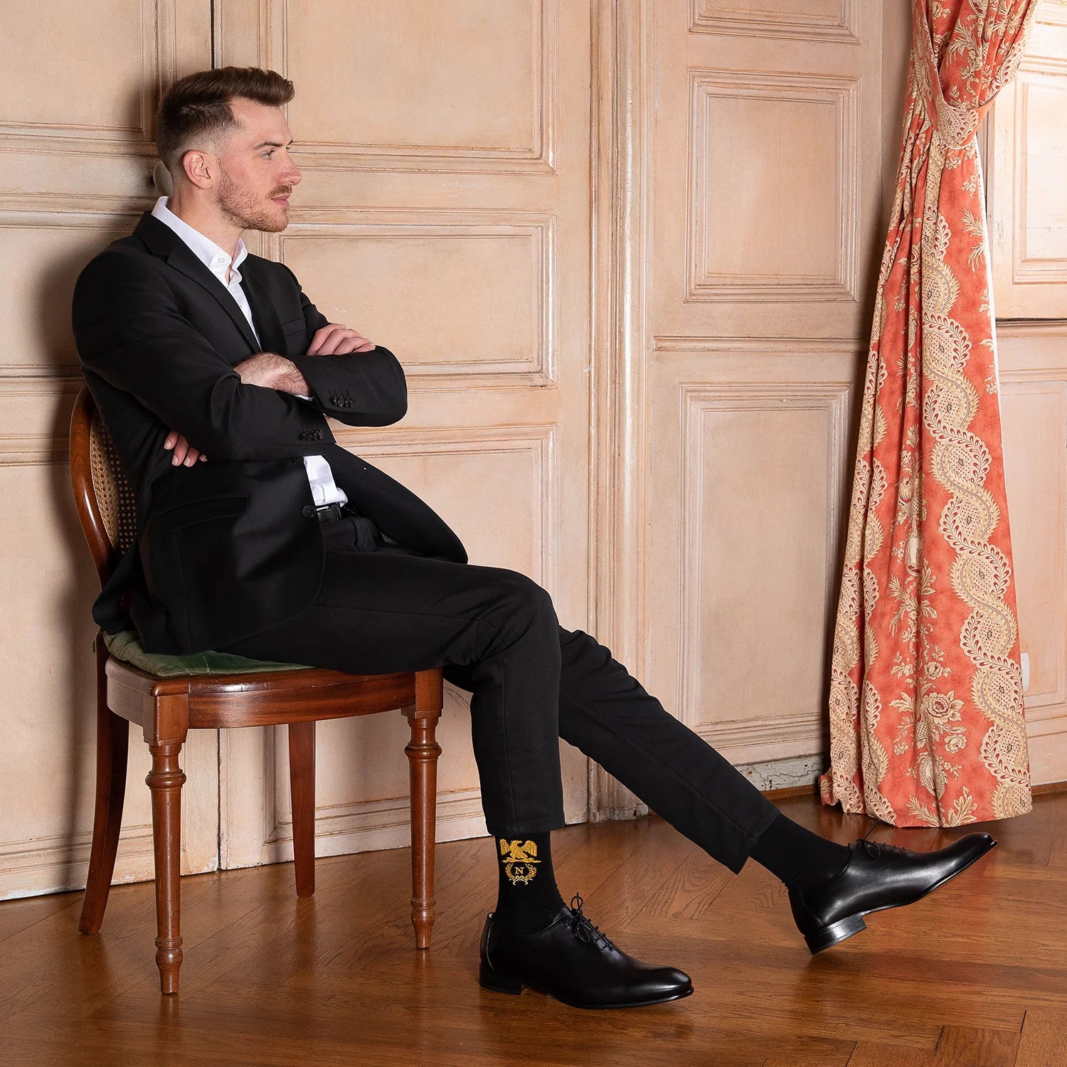 Are you passionate about history, especially that of Napoleon Bonaparte? With this masterpiece dedicated to the French Emperor, you won't be disappointed. This pair of men's socks "Armoirie" (or ‘Coat of Arms’ in English) is made in France, a few kilometres from Limoges. Made from black cotton, it features the emblems of Napoleon Bonaparte embroidered in gold thread. This fashion accessory embodies the elegance, luxury, and grandeur of the Empire. Slip them on and experience comfort and refinement.