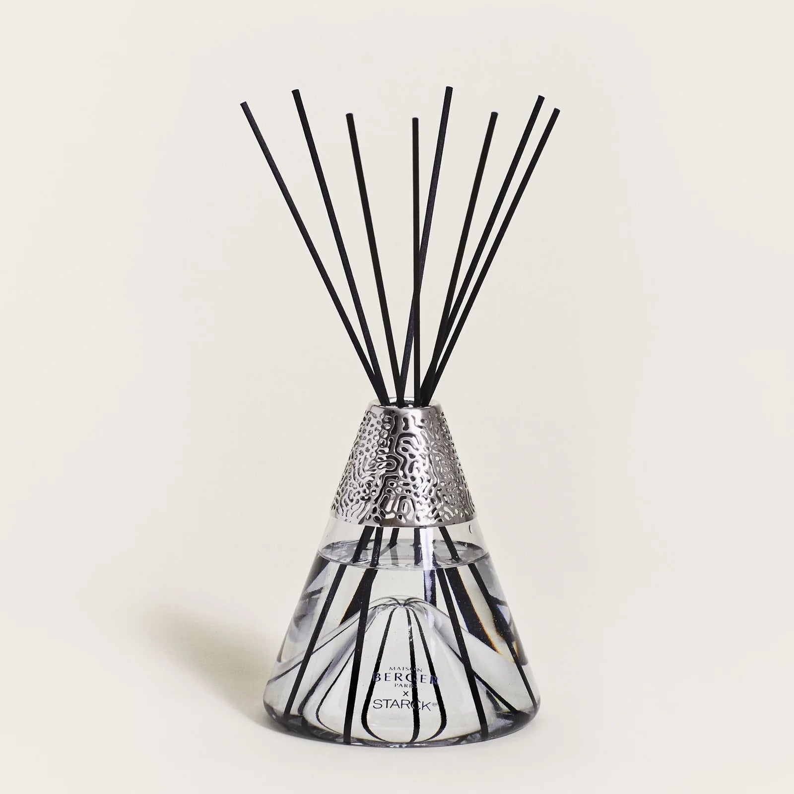 This Peau de Pierre Scented Bouquet by Starck is unique, to the image of its designer, who lent his name and talent to a few creations born from his partnership with Maison Berger Paris. Its timeless lines, along with its simple and pure shape transform this every day object into an iconic piece. Its aesthetic inspiration drawn from laboratory glassware, gives true craftsmanship fineness to it. Recognisable among all, the top of the bouquet’s body is adorned with a metal ring and its distinctive organic motifs with molecular codes. The secret and originality of the Peau de Pierre Scented Bouquet by Starck lies in its studded and screen printed domed base. The grey colour provides it with additional ethereal elegance, used as a nod to the packaging of the Peau de Pierre cologne. Transformed into an indoor fragrance, discover the zesty intensity of bergamot combined with the floral scents of jasmine, dusted with a few spicy and musky hints. This masculine olfactory composition plays on ambiguity by asserting its feminine side.