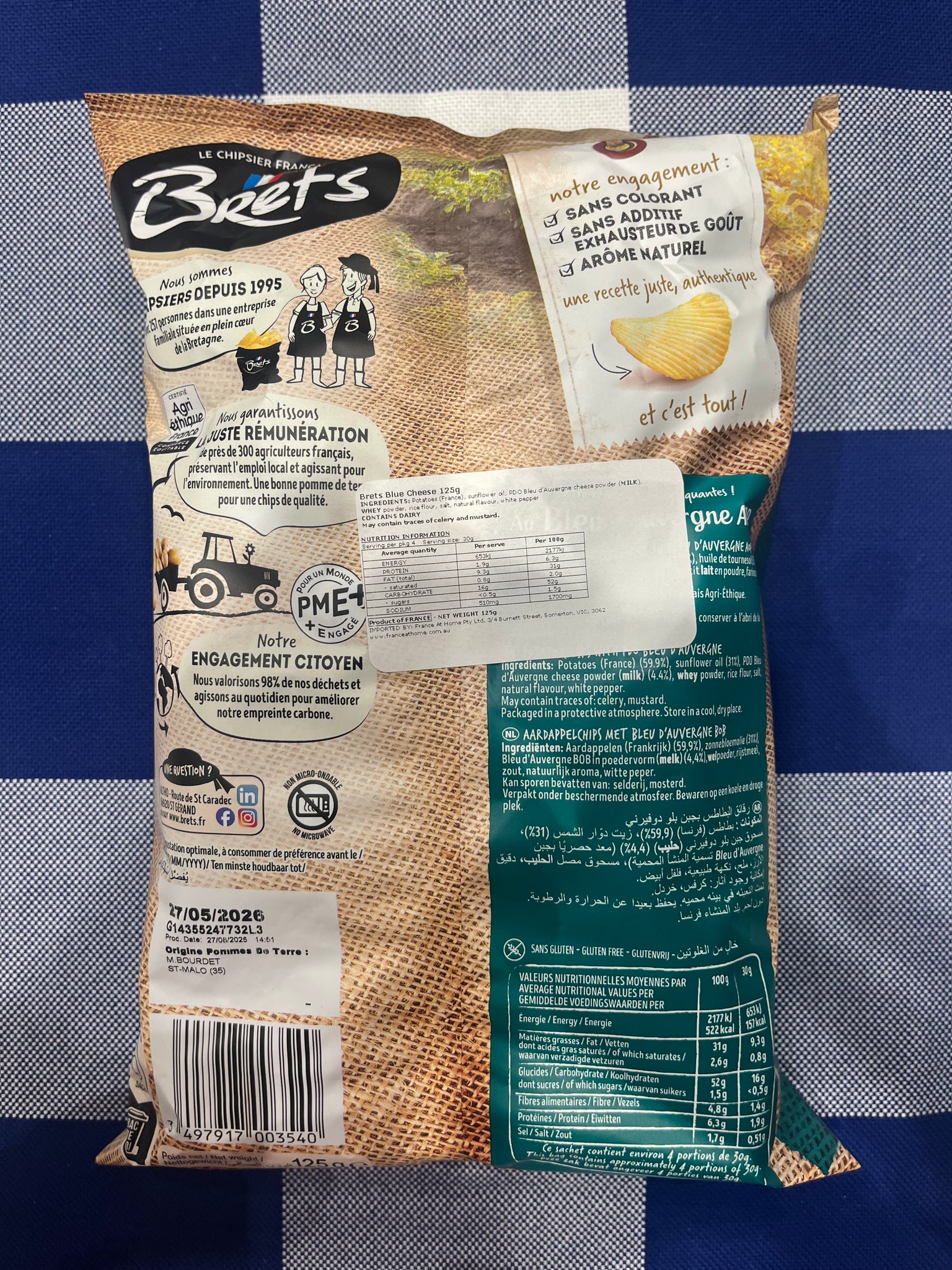 Potatoes (59.9%), sunflower oil (31%), PDO Bleu d’Avergne cheese powder (milk) (4.4%), whey powder, rice flower, salt, natural flavour, white pepper.