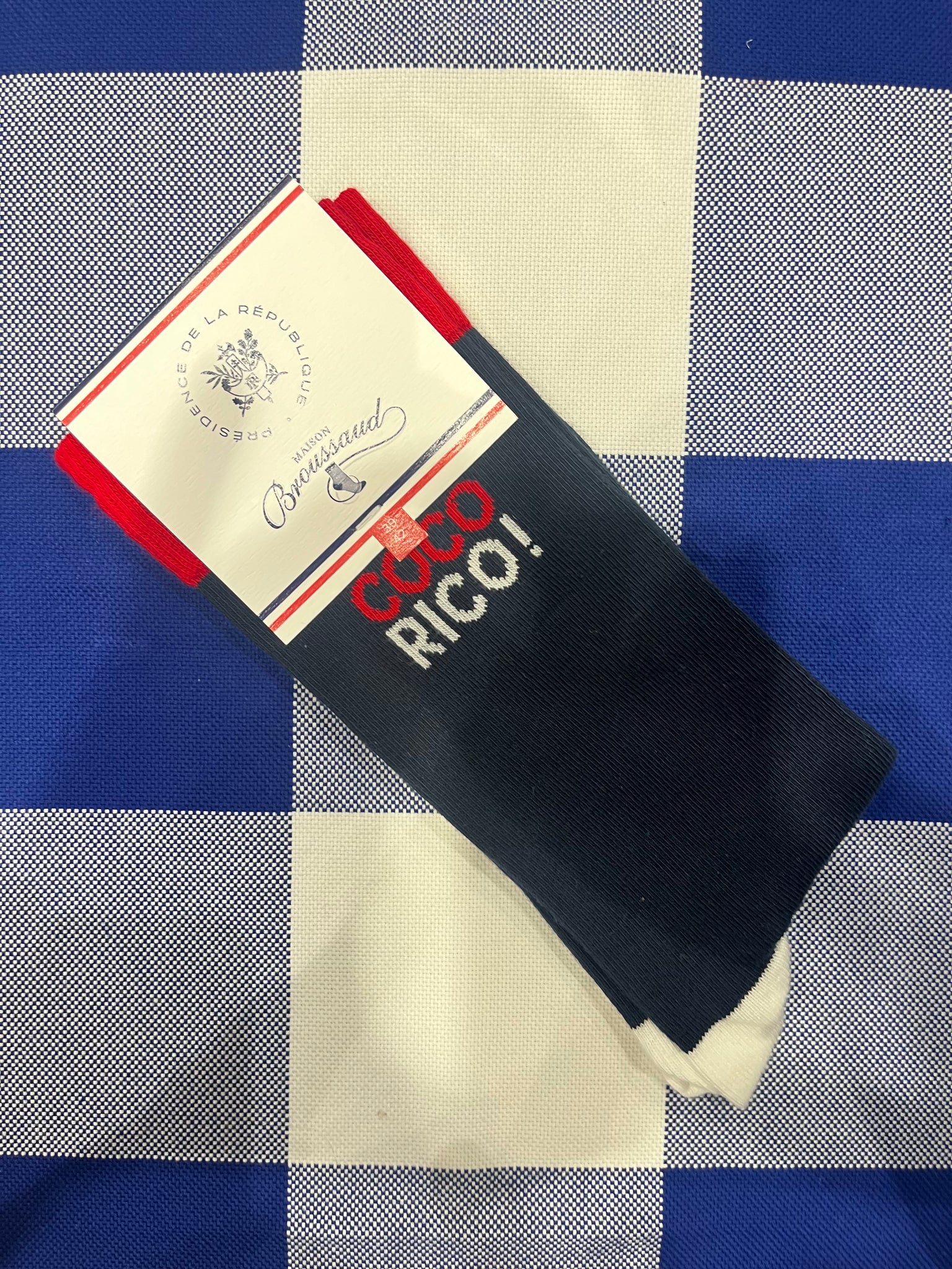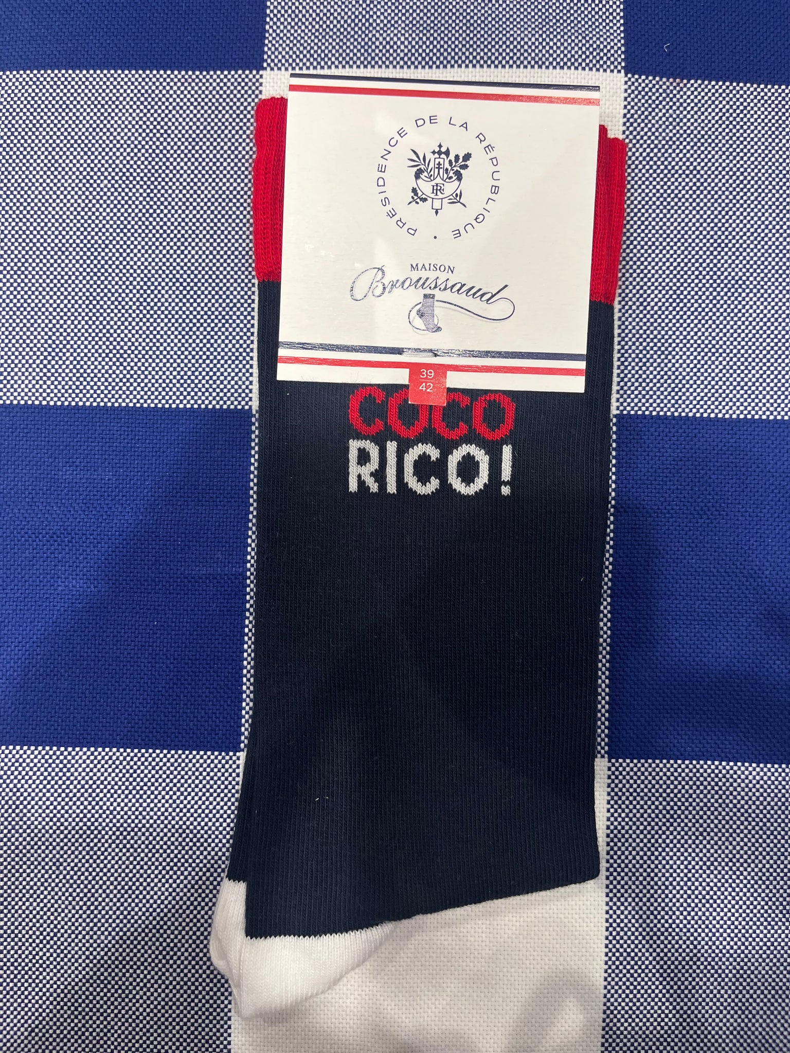 Maison Broussaud socks take on the colours of the Elysée Palace for a collaboration that pays homage to French know-how and heritage. On this navy (white also available) "Cocorico" (aka Cock-a-doodle-doo) model, you will find all the historical know-how and quality of the Maison Broussaud sock manufacturer as well as the highlighting of the tricolour heritage dear to the French Presidency.